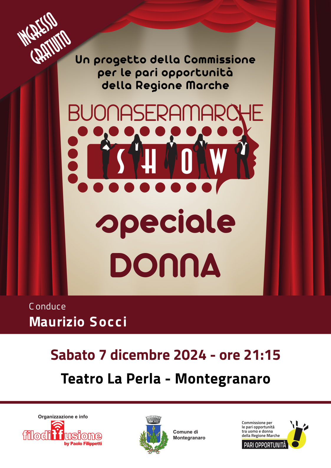 La Commissione per le pari opportunità tra uomo e donna  della Regione Marche organizza l' evento  "Buonasera Marche Show 2024" che ha come obiettivo principale quello di promuovere la consapevolezza e la valorizzazione del contributo delle donne nella società e nel mondo del lavoro. l'iniziativa sarà dedicata al tema del lavoro femminile e delle difficoltà che le donne incontrano nel trovare la loro "collocazione" nel mondo professionale. La serata sarà condotta dal noto giornalista Maurizio Socci, che con il suo stile diretto e appassionato guiderà il pubblico attraverso interviste e momenti di riflessione.